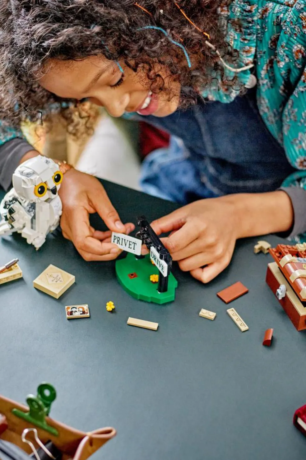 – La figurine de Hedwige possède une tête, des ailes et unequeue articulées et peut se percher sur le panneau «Privet Drive».