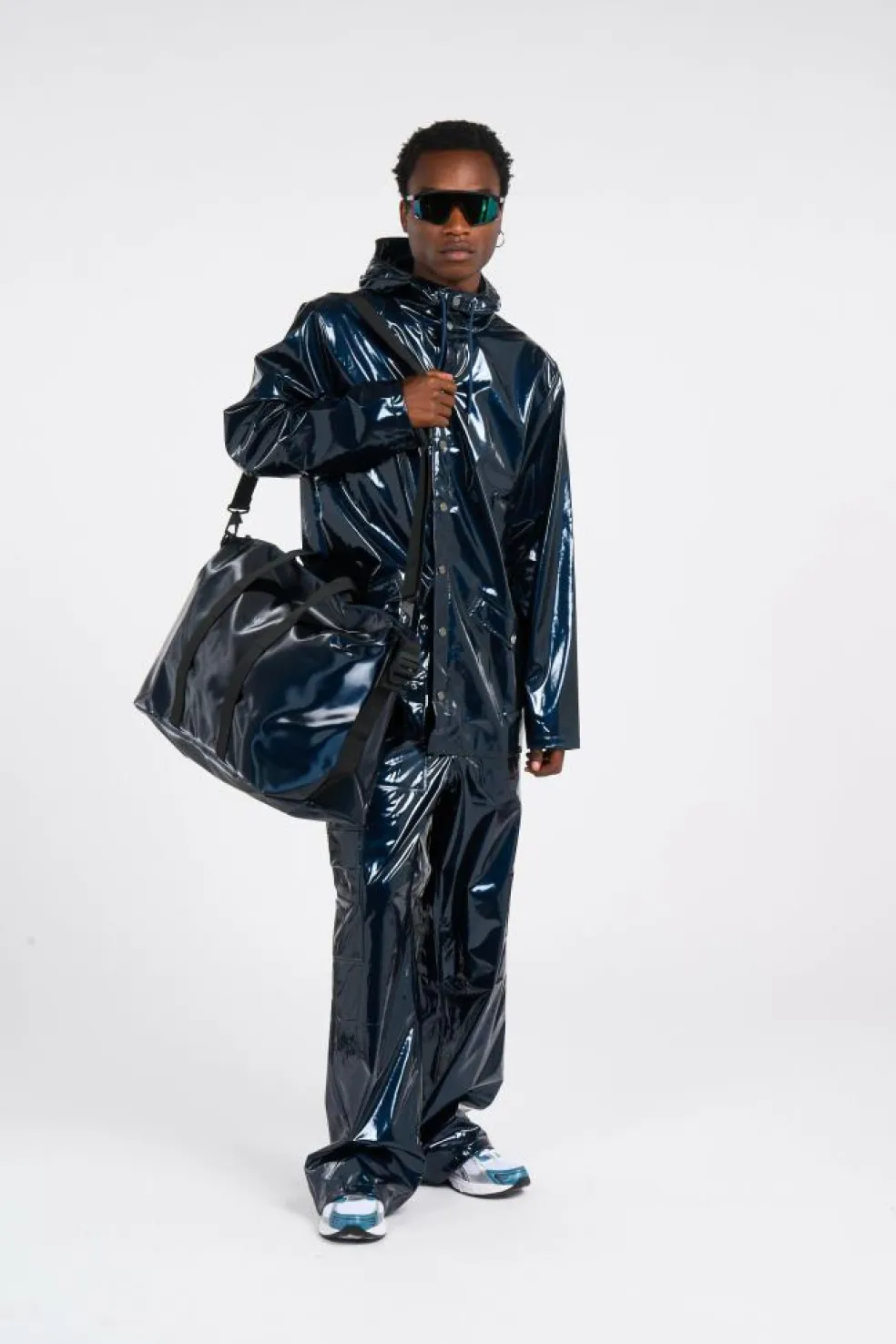 Baskets by ASICS , Coupe-vent imperméable à capuche by RAINS , Pantalon cargo by RAINS