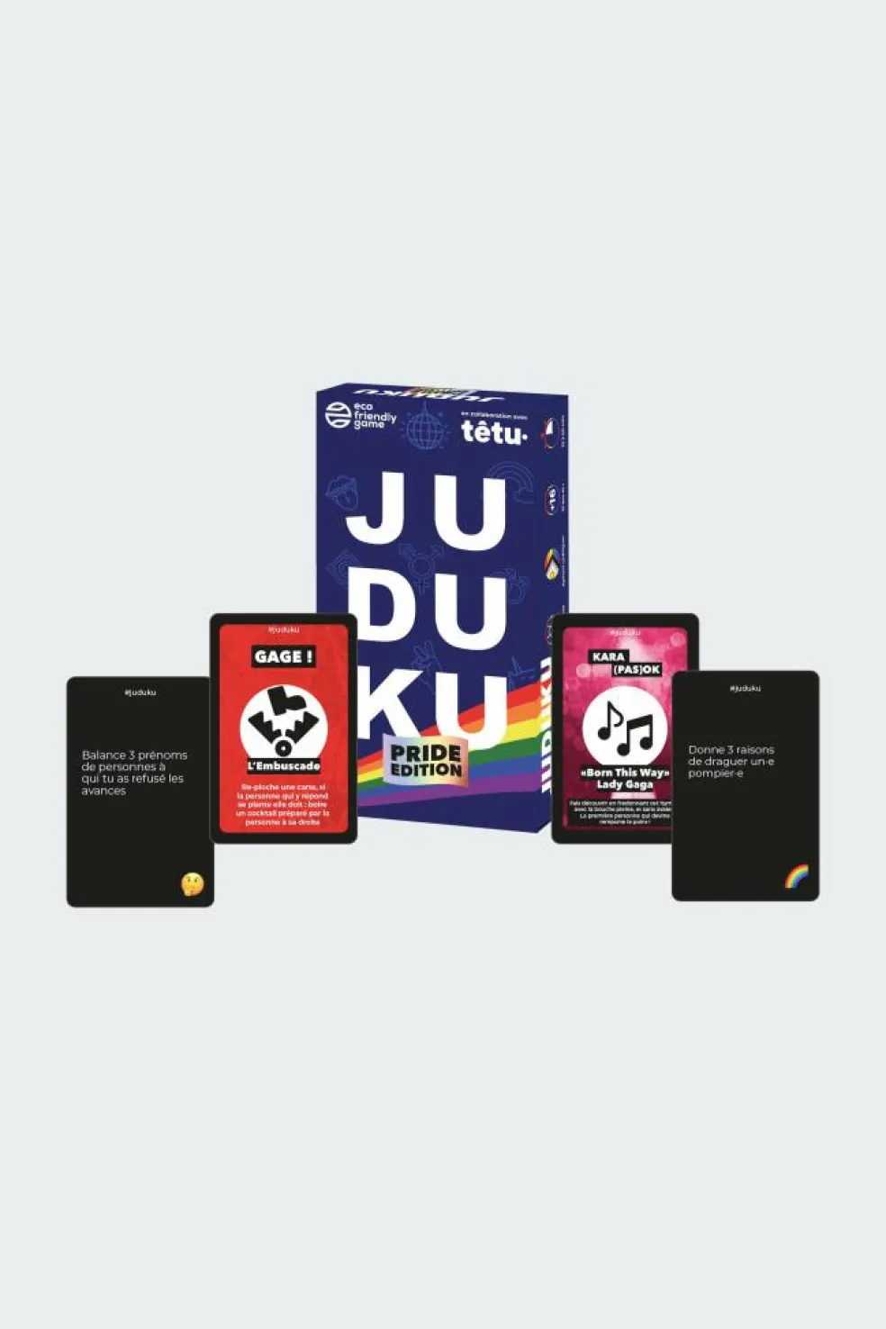 Comme dans le JUDUKU classique, révèle, en 8 secondes, les pires pensées de tes ami(e)s et d’illustres inconnu(e)s avec des cartes demandant de la spontanéité et surtout peu de retenue ! La.Le premier.e joueuse.eur qui atteint le score de 7 points est déclaré.e gagnant.e.