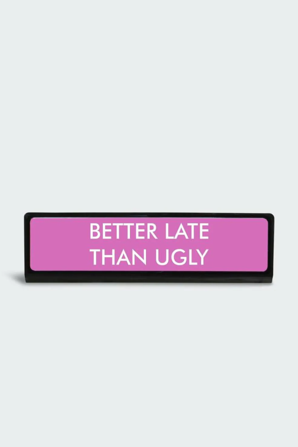 – Message « Better Late Than Ugly » gravé sur fond rose et bordure noire