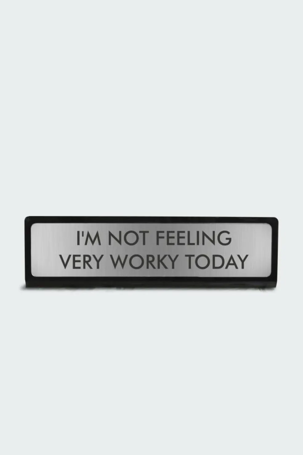 – Inscription « I’m Not Feeling Very Worky Today » gravée sur fond argenté et bordure noire
