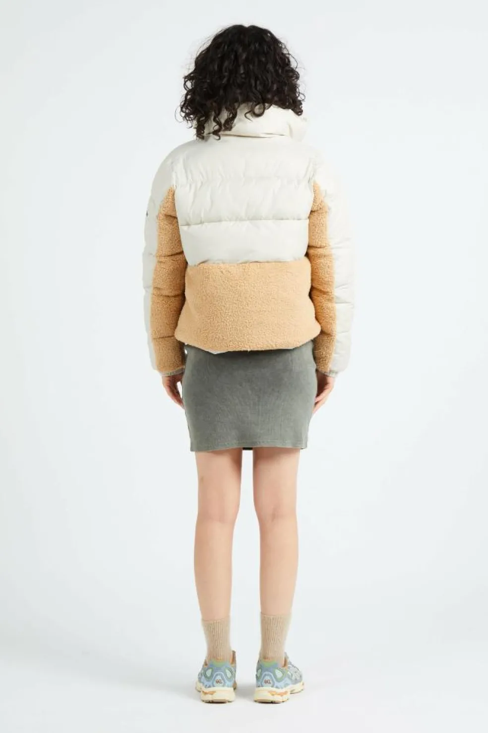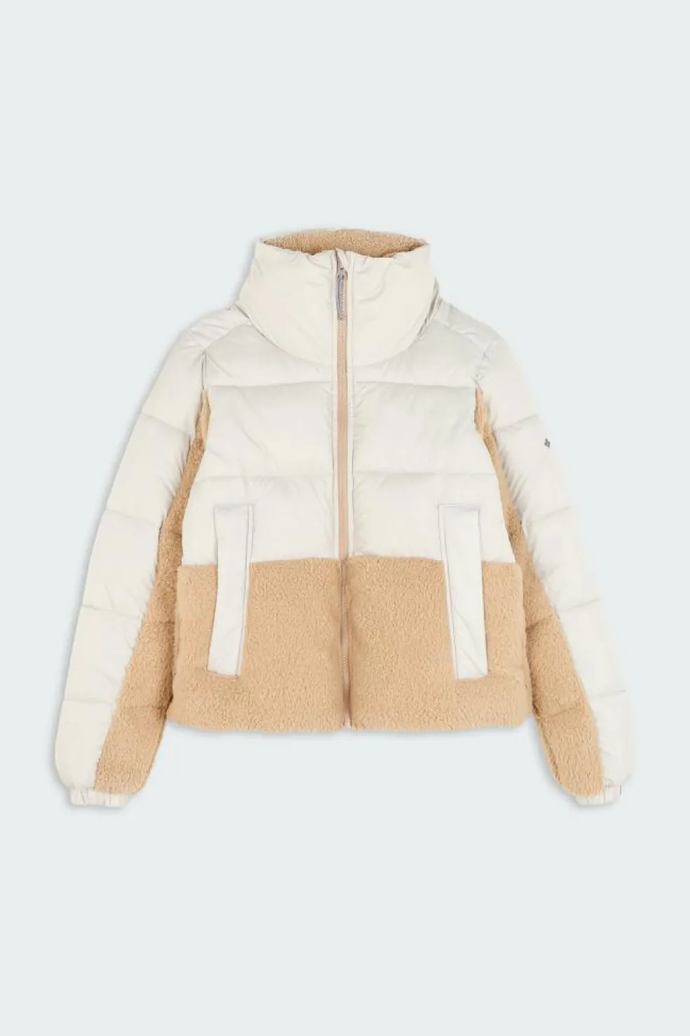 – Aspect bi-matière en tissu lisse et sherpa