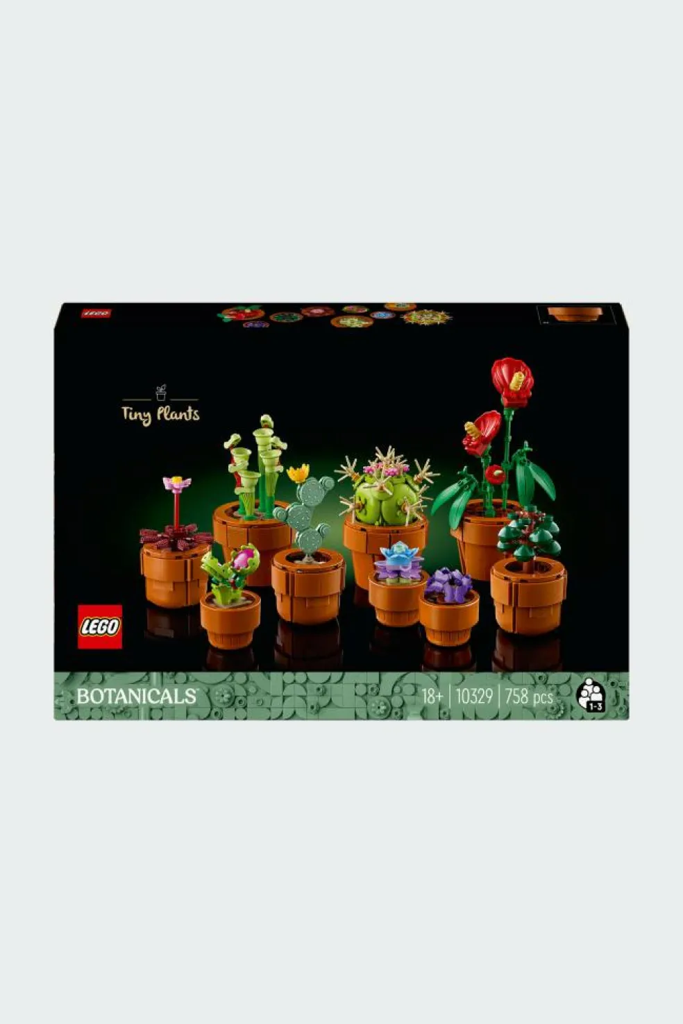 – Le projet de construction LEGO® Icons Les plantes miniatures (10329) inclut des fleurs tropicales, carnivores et de climat aride, chacune accompagnée d’un pot à construire de couleur terre cuite.