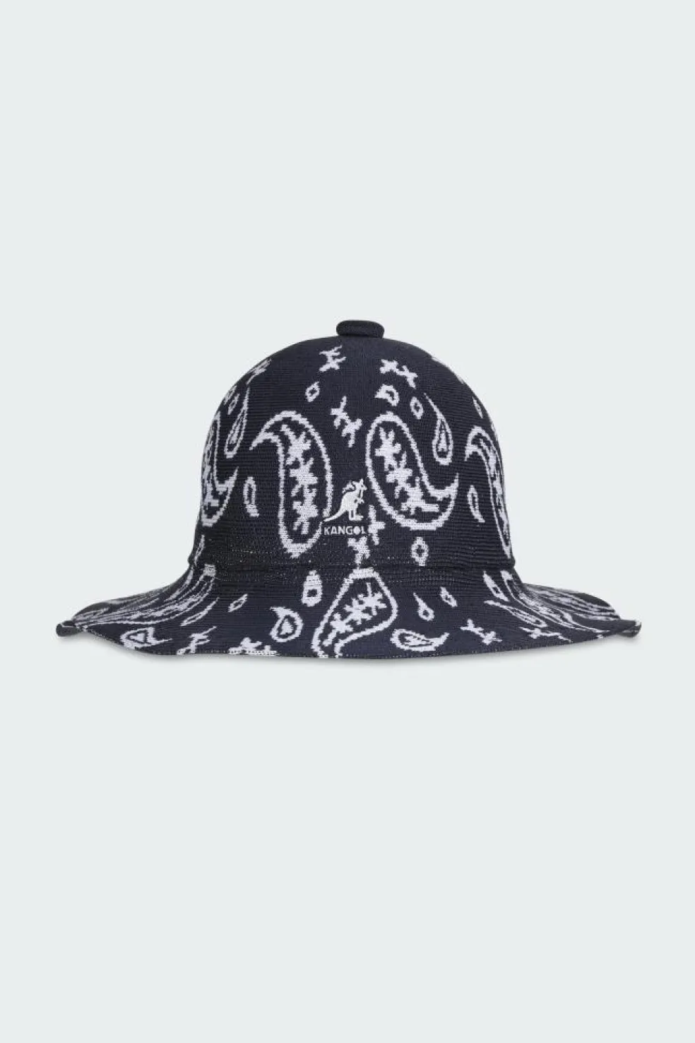 Le Paisley Wide Brim Casual est dans une forme de cloche Casual mais avec un bord légèrement plus large pour une plus grande couverture solaire. Il utilise des techniques de tricot jacquard pour créer un motif bicolore. Le cachemire personnalisé est tricoté partout pour un look cool. Le logo classique Kangol Kangaroo est présent sur le devant.