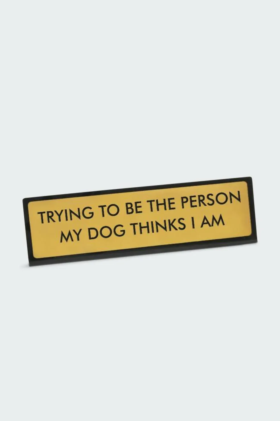 – Inscription « Trying to be the person my dog thinks I am » gravée sur fond doré et bordure noire