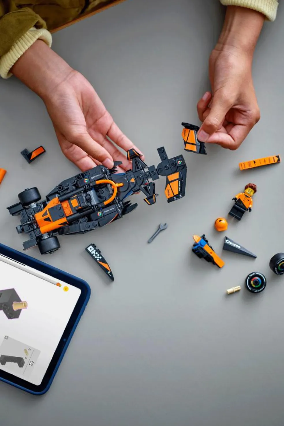 – La voiture s’accompagne également d’une minifigurine de pilote portant une tenue McLaren et un casque.